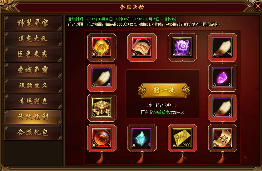 活动说明:活动期间,每获得350活跃度即可抽取1次奖励,已经抽取到的奖励不会再次获得。