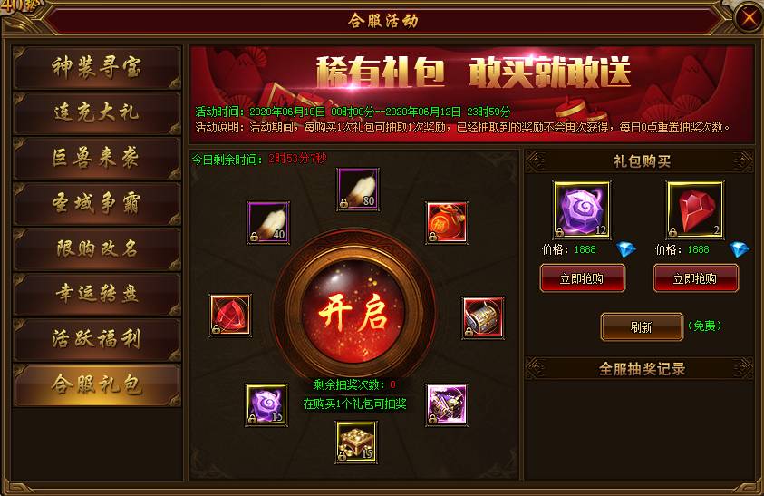 活动三:合服礼包 活动说明:活动期间,每购买1个礼包即可获得1次抽取奖励的机会,已经抽到的奖励不会再次获得,每日0点重置抽奖次数。