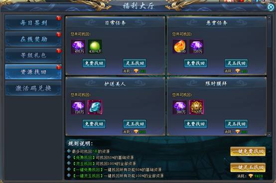 当日错过的活动,通过资源找回玩家可以找回未完成日常活动的奖励。