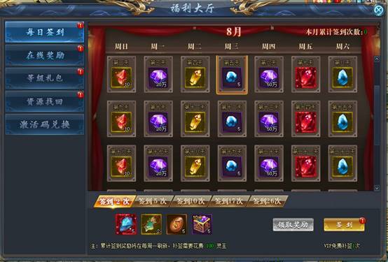 打开福利大厅就可以看签到领奖,签到次数越多,获得奖励越丰富,单月累计签到次数达到特定值后,还有特殊好礼相送。