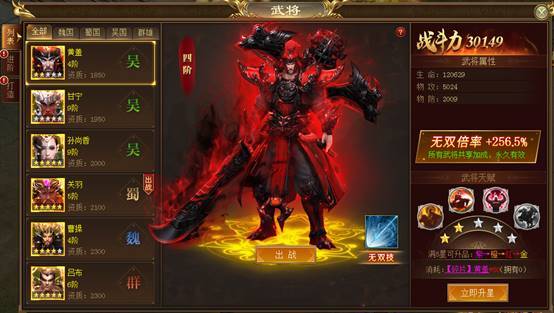 武将觉醒:穿戴满武将专属装备后可觉醒,更换武将外观,并大幅提升武将技能效果